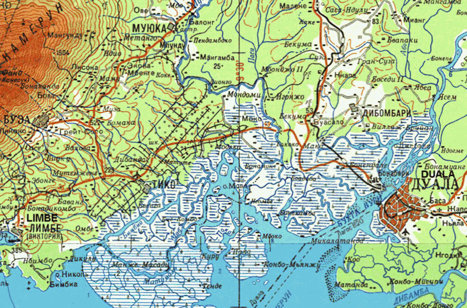 Russian Maps 1:500.000 DVD North: Duala & Limbe - Cameroon (74.1m/pixel) At the bottom of the screen take note of mosaic sheets 0609-B32GN Douala (1985) and 0409-A32BN Yaounde (1983).
